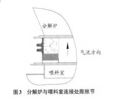 該膨脹節(jié)正處于分解爐底部,來(lái)自料管的物料正撒入其上部不遠(yuǎn)處,因此,時(shí)刻有大量物料沒(méi)有隨著氣流帶走,而是直接通過(guò)膨脹節(jié)進(jìn)入喂料室,也_是塌料。塌下的物料很容易填滿巖棉空間,導(dǎo)致膨脹節(jié)失效。因此,該處的膨脹節(jié)安裝應(yīng)該按照料流方向。