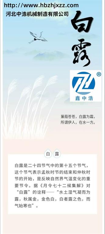 白露時節(jié),鄭國各地大忙時節(jié),一些地區(qū)開始收獲谷子、高粱和大豆,一些地開始采摘新棉,西北地區(qū)則開始播種冬小麥。而河北中浩依然從事波紋補償器、膨脹節(jié)、通風蝶閥、管道連接的制造,專注工藝,創(chuàng)新設計,不斷為客戶提供合適產(chǎn)品而不懈努力和奮斗。