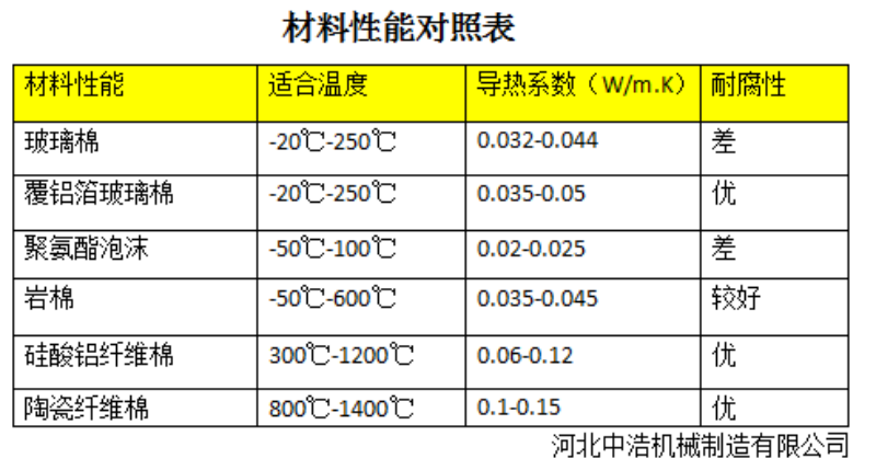 明確溫度范圍,一般分為低溫(-50 ℃-常溫)常見(jiàn)冷庫(kù)管道和液化天氣管系等,注意防止結(jié)露。中溫管道(常溫-300 ℃,常見(jiàn)如蒸汽或熱水系統(tǒng),而高溫(300 ℃-1200 ℃),如鍋爐煙氣或高溫反應(yīng)器管道。還需考慮介質(zhì)特性,如是否屬于腐蝕性氣體或酸堿介質(zhì),流體流速是否過(guò)大,如壓縮機(jī)出口流速較大。還需注意環(huán)境要求,如化工防爆區(qū)需要阻燃材料,防火等級(jí)要求高,如海洋環(huán)境或潮濕地下室需要防潮、防腐。具體可參照下面材料性能對(duì)照表選擇: